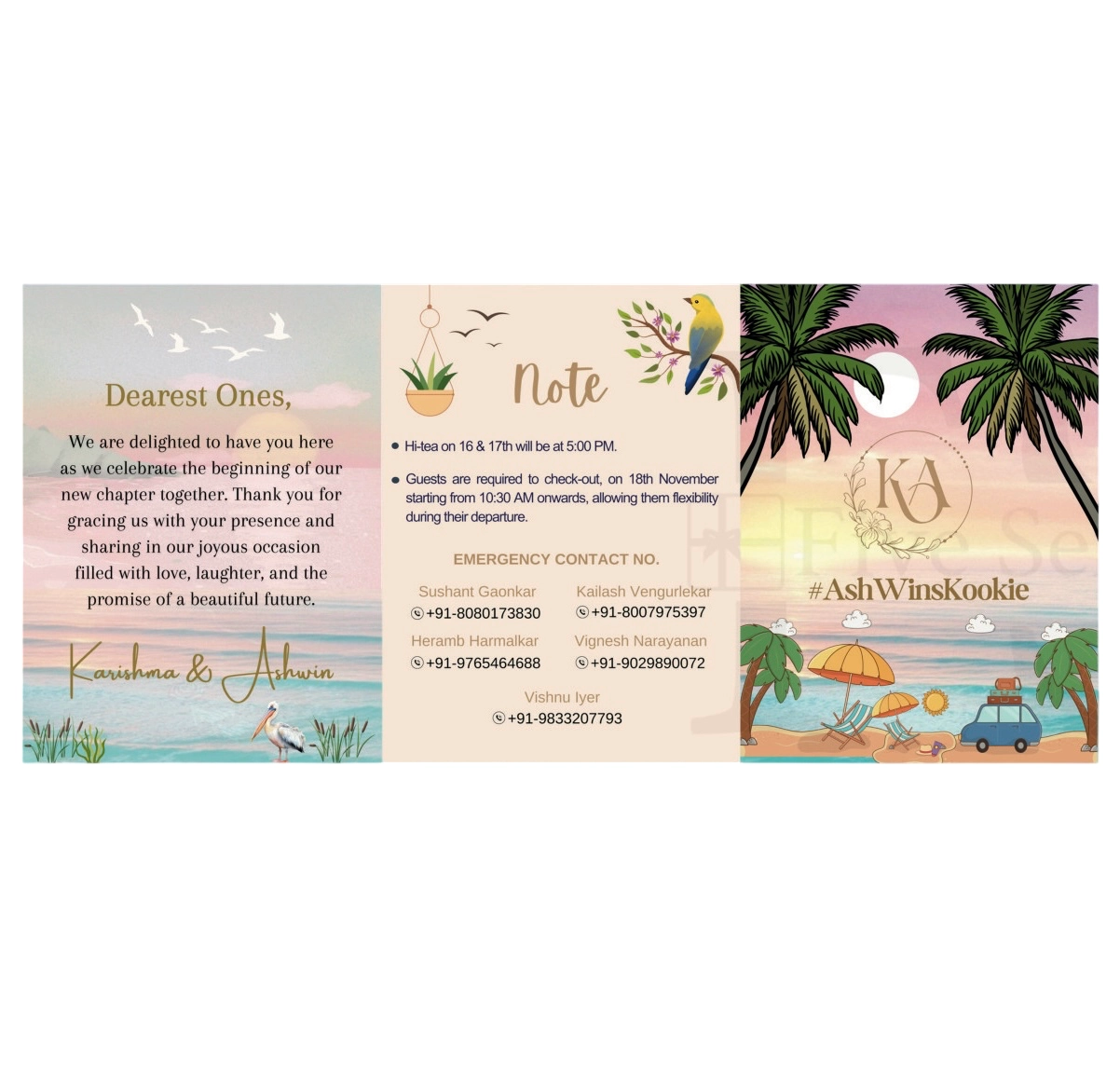 Set the tone for your celebrations with this tropical-themed two fold itinerary card, beautifully illustrated with pastel beaches, palm trees, and playful wedding icons. The three-panel design neatly captures your welcome note, important instructions, emergency contacts, and a clear day-wise schedule of all rituals and functions. Each card is printed on quality cardstock with vibrant, fade-resistant colours, ensuring it doubles up as a keepsake for your guests. Fully customisable with your monogram, wedding hashtag, dates, venues, and artwork to match your décor or destination theme, this itinerary makes it effortless for guests to stay informed and excited for every moment of your big day.